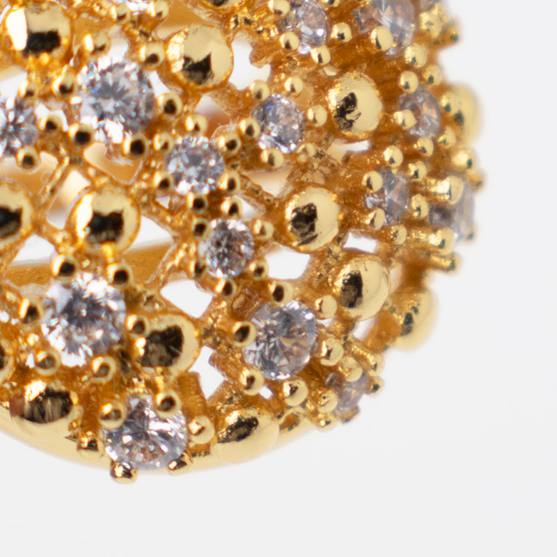 Anillo con circones translucidos con baño en oro de 18k, diámetro del diseño 20 mm.